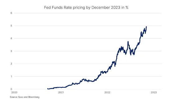 Equities rallied initially on the FOMC press release revealing a 75 basis points hike to 3.75-4% target range and the need for ongoing hikes until rates are sufficiently restrictive, but during the press conference Fed Chair Powell steered the narrative in a completely different direction. Powell said that the Fed still had some ways to go on rates and that the ultimate rate level was going to be higher than previously, expecting touching on a pattern that the Fed’s models have continuously been wrong. Powell basically said that he does not trust the current forecasts and that it is very premature to think about pausing rate hikes. The reaction has been a 25 basis points move higher in the expected Fed Funds Rate in December 2023 (see the chart below), suggesting the market is revising up its terminal rate projection. If the error in inflation forecasts continue with the pattern Powell suggests then this rate will likely continue higher to reflect the ‘higher inflation for longer’ narrative.