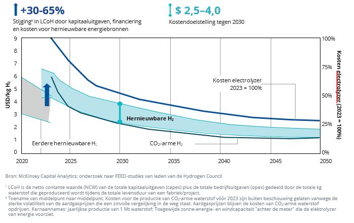 De omvang van de obstakels die nieuwe projecten moeten overwinnen, wordt onthuld in Hydrogen Insights 2023, waarin de Hydrogen Council en McKinsey & Co berekenen dat de kosten voor de productie van hernieuwbare waterstof met wel 65% zijn gestegen, tot ongeveer 4,5 tot 6,5 USD per kilogram. Naast de verhoogde kapitaalkosten noemen ze redenen zoals hogere arbeids- en materiaalkosten, de hogere kosten voor het bouwen van elektrolyse-installaties en een stijging van 30% in de kosten voor hernieuwbare energie.