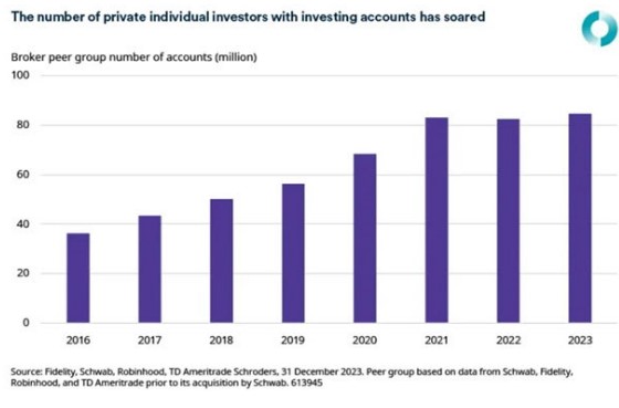 Naast de opkomst van thematische ETF’s heeft de markt ook een sterke toename gezien van particuliere beleggers die actief individuele aandelen kopen. Dit fenomeen werd versterkt door de introductie van commissievrije handel bij grote Amerikaanse brokers en tijdens de coronapandemie werd deze trend versterkt door de explosieve groei van het aantal particuliere beleggingsaccounts. De ‘meme stock’-hype, zoals bij GameStop, bracht beleggen onder de aandacht van een breed publiek.