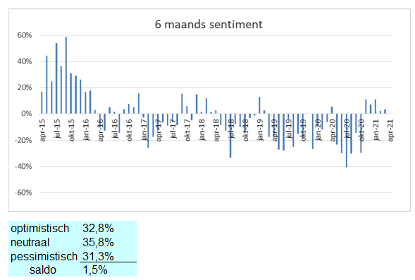 Voor de lange termijn is men niet zo zeker over de beurs. Het percentage positieve antwoorden is vrijwel gelijk aan het percentage negatieve antwoorden. Er zijn experts die zich wat zorgen maken over de monetaire omstandigheden en de toename in de inflatie.