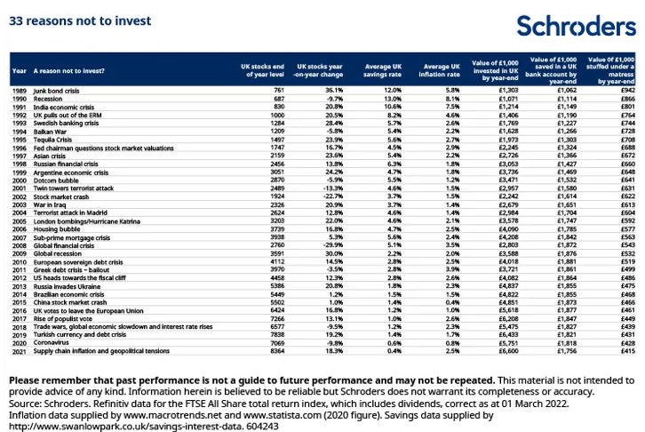 De afgelopen vier decennia zijn er tal van schokken op de aandelenmarkten geweest die mensen ervan kunnen weerhouden om te beleggen. Schroders heeft onderzocht wat er is gebeurd na zulke schokgolven. Volgens Nick Kirrage, fondsbeheerder bij Schroders, bestaat er geen perfect instapmoment, maar tonen onderzoeksgegevens wel aan dat beleggen op de lange termijn meer oplevert dan sparen.